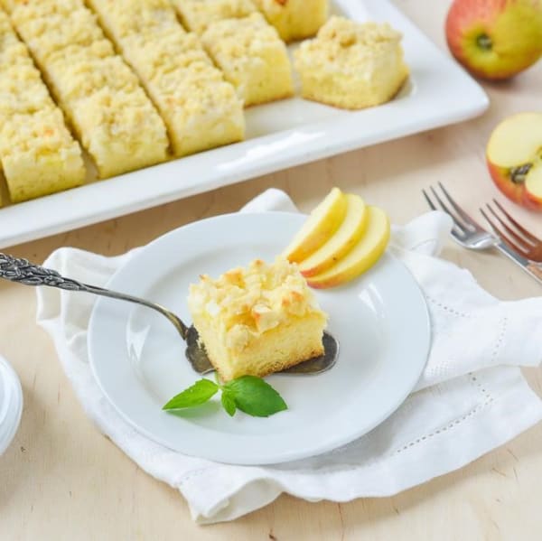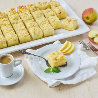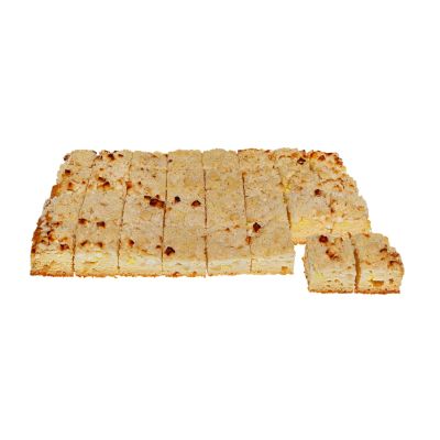 Uunissa paistettu piirakkapohjainen kakku, jonka päällä on vaniljanmakuista täytettä, omenapaloja, kanelia ja muruseosta. Laktoositon. Leikattu 32 palaan.
