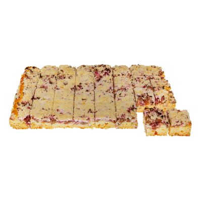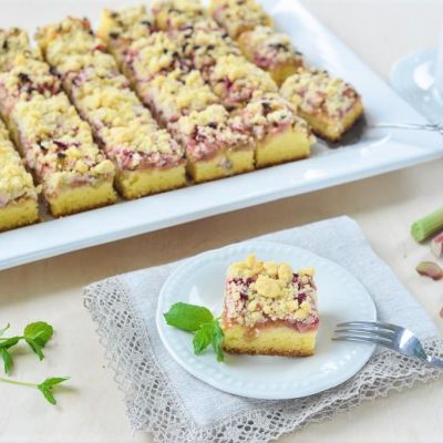 Perinteinen piirakkapohja. päällystetty raparperilla. Päällä taikinanmurusia. Laktoositon. Leikattu 32 palaan.