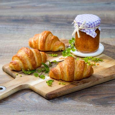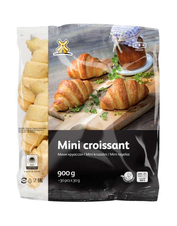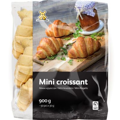 Mini croissant margariinilla. Täydellinen vaihtoehto voicroissantille. Tuote sopii vegaaneille. Pakkaus soveltuu vähittäiskauppaan, paistopisteeseen tai Horeca:lle.