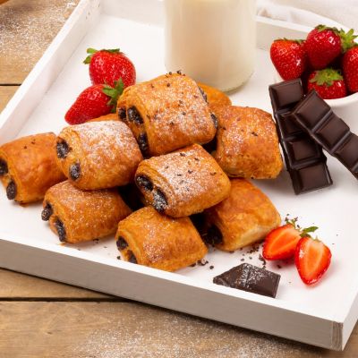 Vähittäispakattu. Tanskalainen lehtitaikinakierre kaakaolla ja hasselpähkinöillä täytteellä.