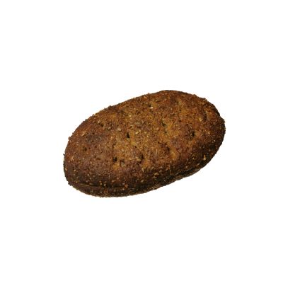 Ovaalin muotoinen täysjyväruisleipä, halkaistu. Ei lisättyä sokeria. Laktoositon.