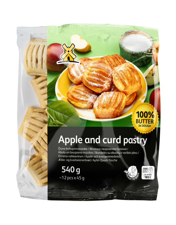 VEHNÄJAUHO, VOI 13%, RAHKA 13%, vesi, omenatäyte 11% (omena 45%, sokeri, vesi, maissitärkkelys, sitruskuidut (sitruuna, lime), sitruunamehutiiviste, luonnollinen aromi), rahkan stabilointiaine (sokeri, maissitärkkelys, VEHNÄTÄRKKELYS, glukoosi, MUNANVALKUAISJAUHE, suola, aromi), KERMA (sis. stabilointiaineen: E407), sokeri, kokonainen MUNAMASSA, hiiva, kiille (vesi, herneproteiini, dekstroosi, maissitärkkelys), suola, VEHNÄGLUTEENI, emulgointiaine: E472e, jauhonparanne: E300, entsyymit (VEHNÄ). Pääraaka-aineen alkuperä: EU.