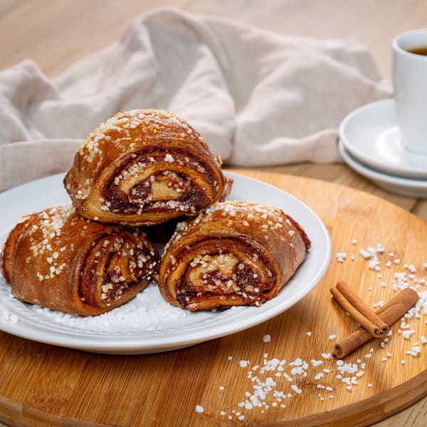 Hiivataikinarulla kanelitäytteellä, kardemummalla maustettu, raesokerilla koristeltu. Vähälaktoosinen. Vegaaninen.